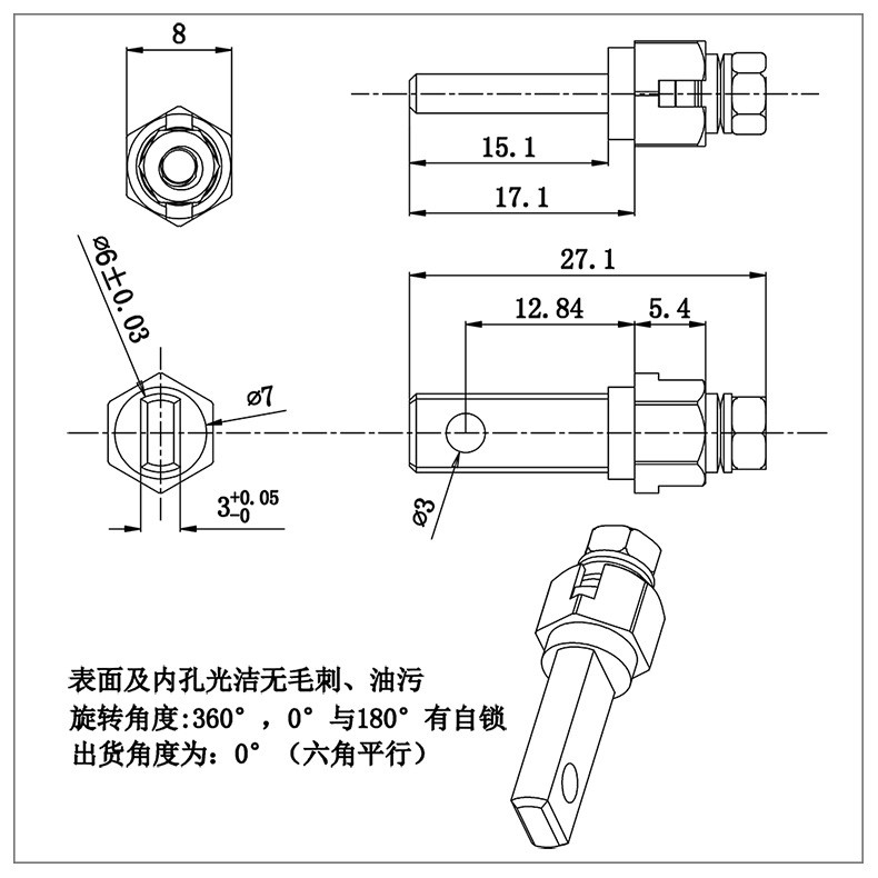 臺燈金屬支架轉軸的軸套為六邊形,軸件銑扁,裝配時從臺燈活動關節一側壓入即可使用,軸件固定,軸套轉動。