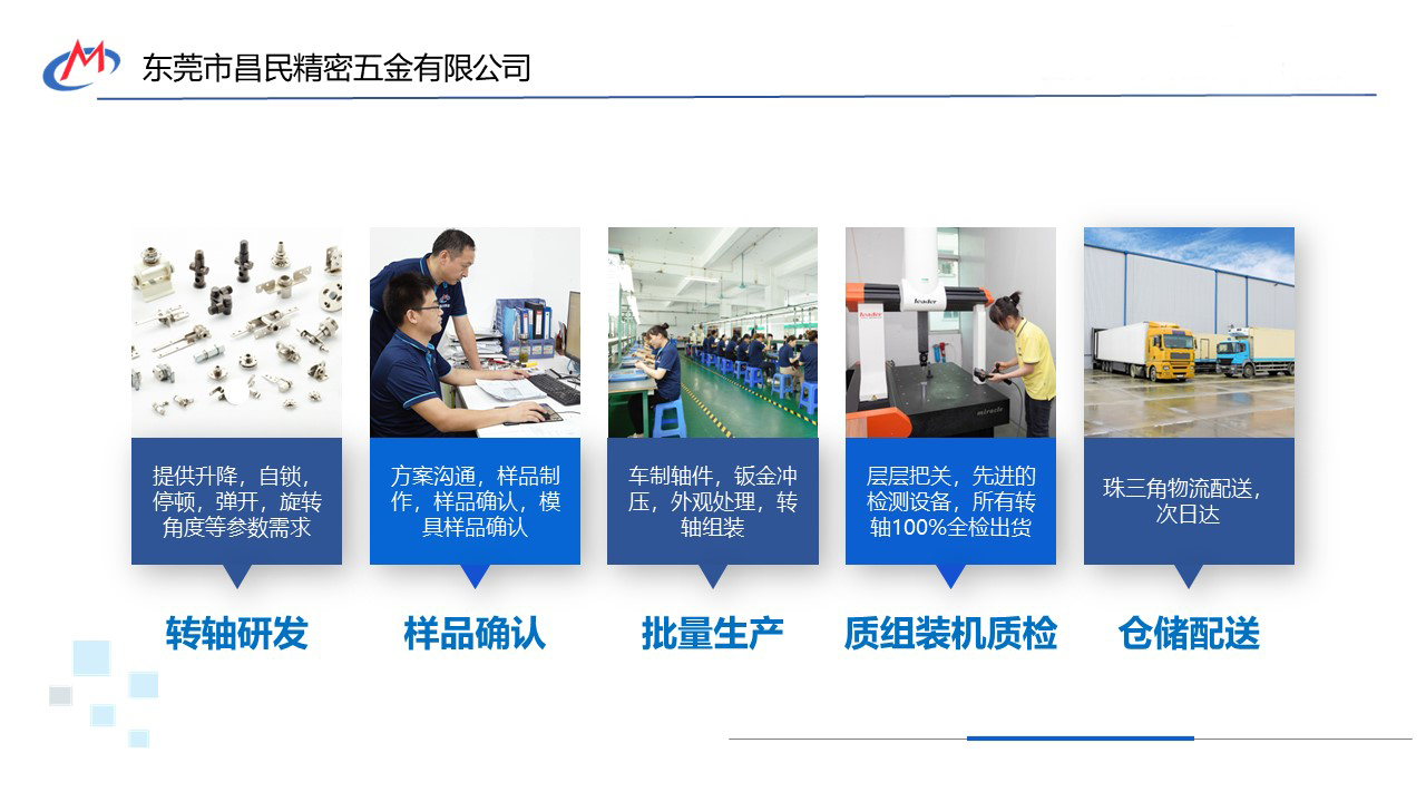 昌民精密注是東莞一家研發(fā)、生產(chǎn)各類(lèi)筆記本電腦轉(zhuǎn)軸、DV轉(zhuǎn)軸、LCD轉(zhuǎn)軸、電話(huà)轉(zhuǎn)軸、手機(jī)平板轉(zhuǎn)軸、臺(tái)燈轉(zhuǎn)軸、學(xué)習(xí)機(jī)器轉(zhuǎn)軸、醫(yī)療設(shè)備轉(zhuǎn)軸、一體機(jī)轉(zhuǎn)軸、精密數(shù)控車(chē)削件、沖壓件等五金產(chǎn)品的轉(zhuǎn)軸生產(chǎn)廠(chǎng)家。昌民的轉(zhuǎn)軸產(chǎn)品已廣泛應(yīng)用于筆記本電腦、平板手機(jī)皮套、汽車(chē)、臺(tái)燈照明、無(wú)人機(jī)、收音機(jī)、耳機(jī)、醫(yī)療、戶(hù)外設(shè)備、軍工等各個(gè)領(lǐng)域。公司已通過(guò)ISO9001:2015質(zhì)量認(rèn)證體系,以合理化、標(biāo)準(zhǔn)化、系統(tǒng)化、自動(dòng)化為標(biāo)準(zhǔn)作業(yè),為客戶(hù)提供優(yōu)秀的產(chǎn)品和良好的服務(wù)。如果您有轉(zhuǎn)軸定制的需求,以上是昌民的定制流程。